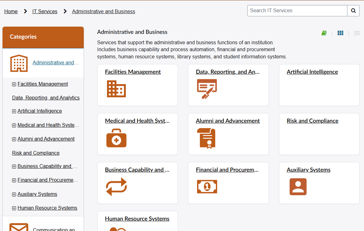 • Click on categories to view available business services and service offerings or use Search.